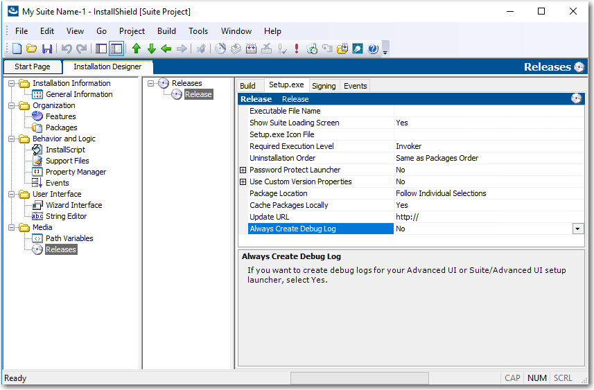 In previous releases, if you wanted to make updates available for an Advanced UI or Suite/Advanced UI setup launcher for download to target systems, you would enter the absolute path URL to that location in the Update URL field on the Setup.exe tab of the Releases view.